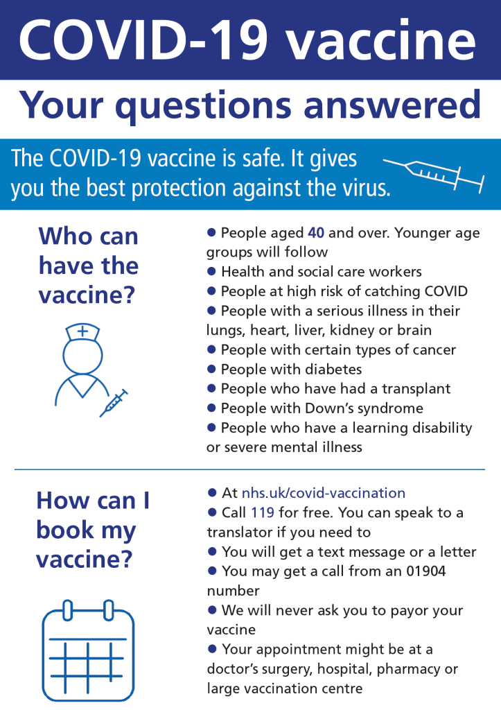 General-purpose information leaflet about the COVID-19 vaccination programme in the Vale of York, for print distribution by staff and partner organisations to support awareness. Available to view as spreads (front and back plus inside pages) or individual pages.
